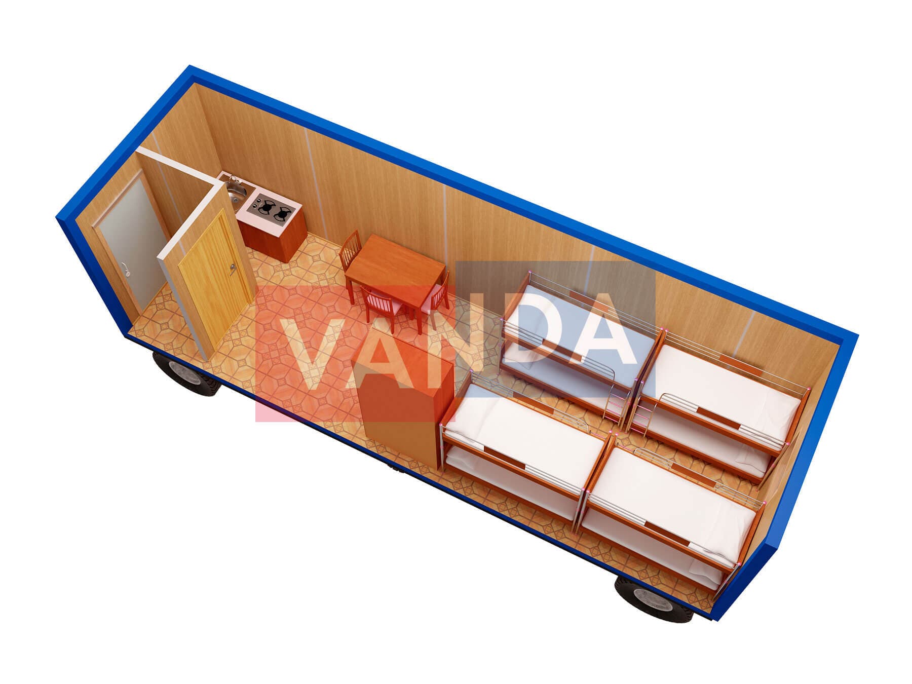 Мы сами изготавливаем жилой вагончик на шасси 8,0 x 2,4, общей площадью 19.2 квадратных метров, имеющий наиболее доступную цену в нашем каталоге, и предлагающий широчайшие возможности для модернизаций. Простое решение с минимальными затратами.